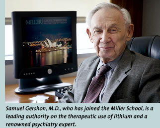 Now a leading authority on the therapeutic use of lithium in treating affective disorders and an internationally recognized psychiatry expert, his research has influenced the way bipolar disorder is treated throughout the world. “ Dr. Gershon has an incredible research background and considerable experience in academic enterprise building, and we are thrilled to have him as part of our team,” says Julio Licinio, M.D., professor and chairman of the Department of Psychiatry and Behavioral Sciences. Gershon earned his medical degree from the University of Sydney, Australia in 1950. In 1963 he moved permanently to the United States, where he became the principal research scientist in pharmacology at the Missouri Institute of Psychiatry. In 1988 he moved to the University of Pittsburgh and retired from that institution in 2003. “ I tried retirement—but I wasn’t any good at golf, and I didn’t like the clothes they [golfers] wore,” says Gershon. “I knew Dr. Licinio as a colleague, and I was delighted and enthusiastic when we began discussing the possibility of working together here at the Miller School of Medicine.” Gershon moved to Miami a year ago, saying, “I ran away from the cold weather.” “