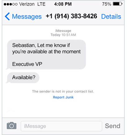 - Verify the source: If you receive a text message that appears to be from a University department or senior executive, do not respond directly. Instead, take a moment to verify the legitimacy of the message. You can do this by reaching out to the relevant department or by reporting the suspicious text to phish@miami.edu.